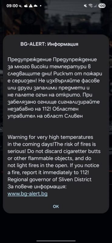 На 27 юли в Сливен за втори път този месец бе задействана системата за спешни известия BG-Alert. В неделя сутринта в 09:00 ч. жителите получиха предупреждение за очаквани много високи температури и сериозен риск от пожари през следващите дни.