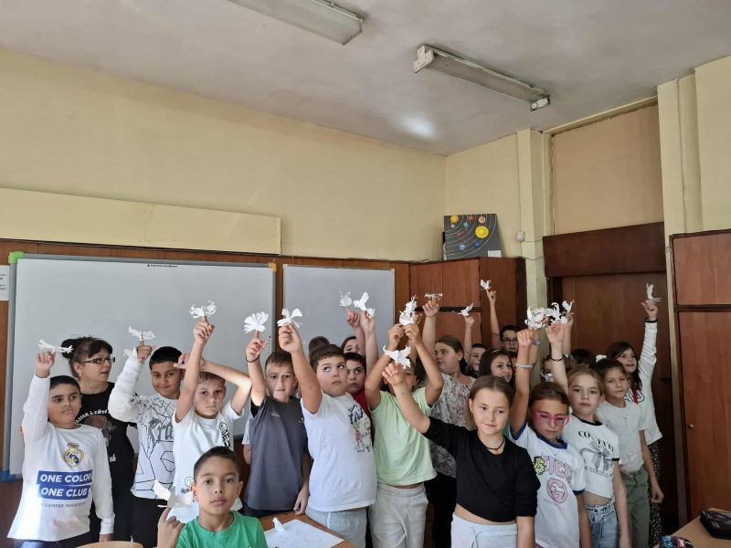 Децата изработиха символи на мира – бели хартиени гълъби, които украсиха класните стаи и станаха послание за надежда, приятелство и взаимно разбирателство. Г-жа Михова проведе интерактивно занятие, в което учениците научиха как могат да бъдат носители на мир чрез добри думи, постъпки и уважение към другите.