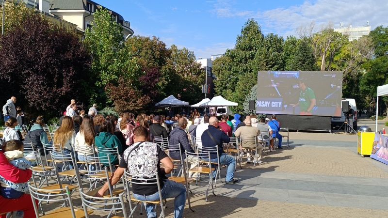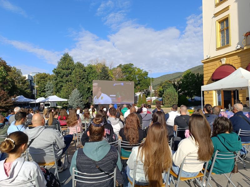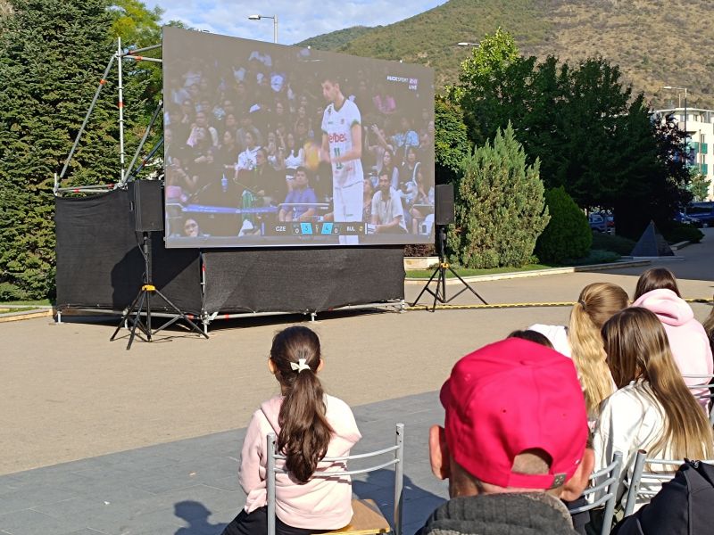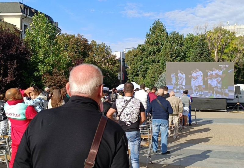 Българският отбор започна мача срещу Чехия. Първите зрители на площада пред Община Сливен станаха прави по време на националния химн и вече следят волейболната среща.