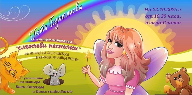 На 22 октомври в зала „Сливен“ от 10:30 часа малчуганите от детските градини в града ще могат да се насладят на концерт-спектакъла „Слънчеви песнички“ на Петя Буюклиева. Заедно с популярната изпълнителка на сцената ще се включат актьорът Боян Стоянов и специалните гости от балет „Барби“ към военния клуб.