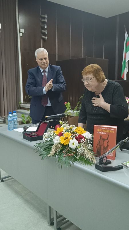 Доц. Мария Тодорова с плакет на Община Сливен при представянето на Алманах II „Ние, медиците“