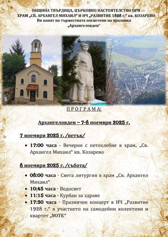 Община Твърдица отправя покана към жителите и гостите на града да се включат в празничното отбелязване на Архангеловден на 8 ноември.