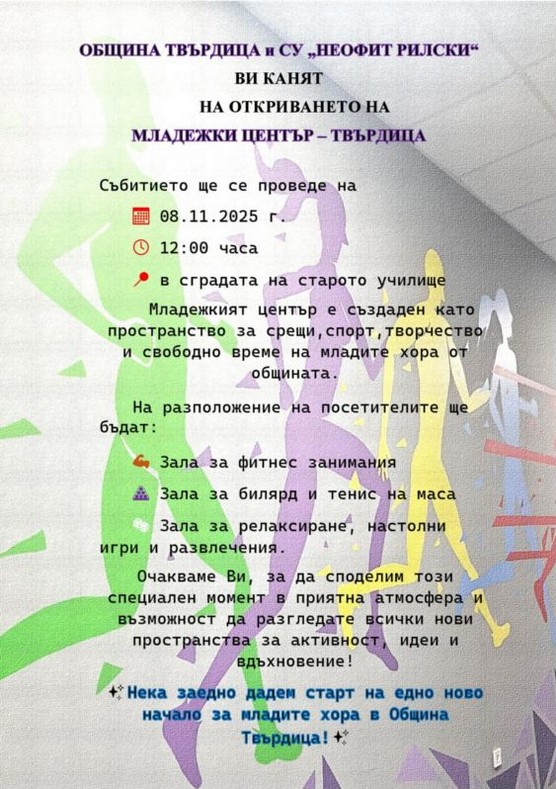 На 8 ноември (събота) от 12:00 ч. в сградата на старото училище в Твърдица ще бъде открит нов Младежки център, създаден по инициатива на Община Твърдица и СУ „Неофит Рилски“.