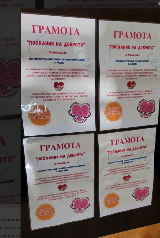 В рамките на инициативата в четири училища бяха поставени табла „Стена на доброто“, на които учениците записваха свои добри дела или такива, които са видели у съученици. Това стимулира внимателност, емпатия и съпричастност и показа, че дори малките жестове имат силно положително влияние.
