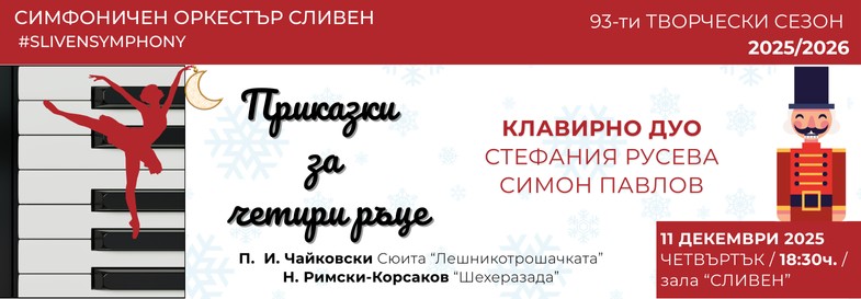 Тази празнична магия ще оживее в камерния концерт „Приказки за четири ръце“, където младите пианисти Стефания Русева и Симон Павлов ще представят любимата коледна история за „Лешникотрошачката“ и четири приказки от „Шехеразада“. Събитието ще се състои в четвъртък, 11 декември, от 18:30 ч. в зала „Сливен“.