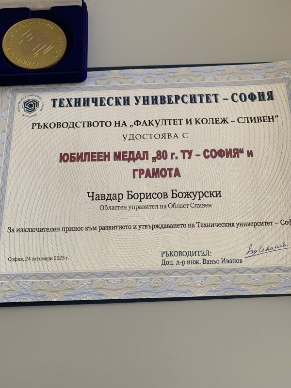 Областният управител Чавдар Божурски получи медал за принос към Технически университет – София