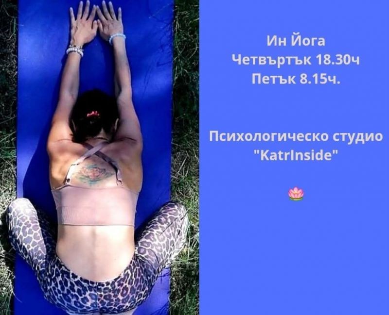 В Психологическо студио „KatrInside“ днес от 18:30 часа и утре в 08:15 часа ще се проведе Ин йога сеанс. В йогата се се набляга на естественото отпускане: гравитацията и времето вършат работата вместо силови усилия. Дълбочината в практиката идва от постоянството, а не от напрежението.