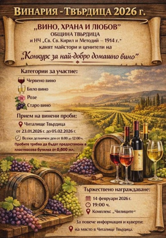 Под мотото „Вино, храна и любов“ Община Твърдица и НЧ „Св. Св. Кирил и Методий – 1914 г.“ канят майстори и ценители на домашното вино да се включат в „Винария – Твърдица 2026“. В рамките на събитието ще се проведе традиционният конкурс за „Най-добро домашно вино“ в категориите червено, бяло, розе и старо вино. Приемът на пробите ще е от 23 януари до 5 февруари 2026 г., всеки делничен ден от 08:00 до 12:00 часа в читалището, като вината трябва да бъдат предоставени в пластмасова бутилка от 0,5 литра.
