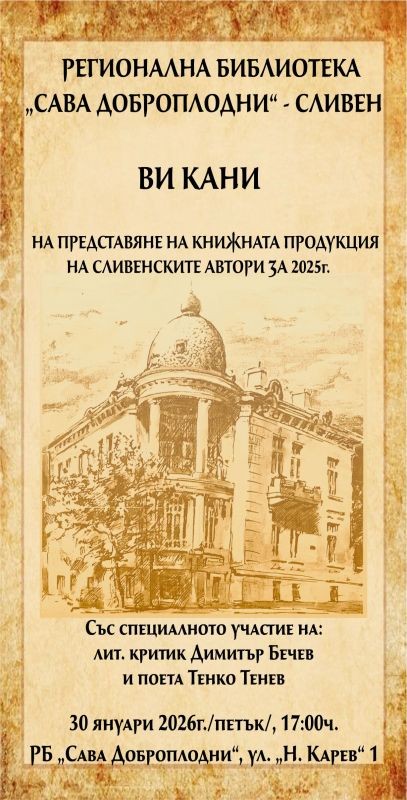 На 30 януари 2026 г., от 17:00 ч., в Регионална библиотека „Сава Доброплодни“ в Сливен ще бъде представена книжната продукция на автори от Сливен и региона за 2025 г. Над 50 издания – включително поезия, проза, научни и научно-популярни книги, както и произведения за деца – ще бъдат включени в първия за годината „Петъчен литературен салон“.