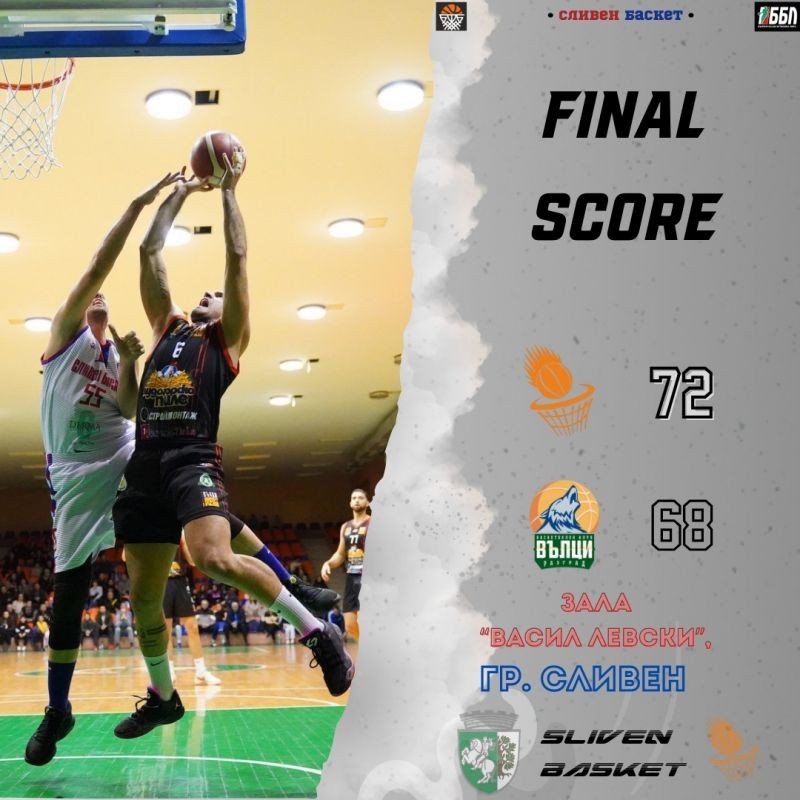 Сливен Баскет записа изключително важна победа със 72:68 над Вълци Разград в среща от 15-ия кръг на ББЛ А група – Изток. Успехът дойде след драматичен обрат, след като домакините изоставаха почти през целия двубой, но в последната четвърт показаха силен характер и отличен колектив, за да стигнат до победата.