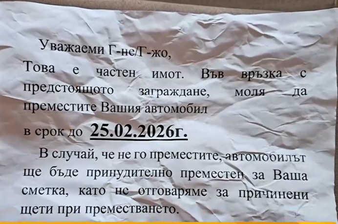 Живеещите в четири блока в столичния квартал „Мусагеница” се събудили със заплашителни бележки върху автомобилите си. В тях се посочвало, че ако колите не бъдат преместени от паркинга пред блока, ще бъдат принудително вдигнати, като авторът на съобщението отказва да носи отговорност за евентуални щети. За случая съобщава NOVA.