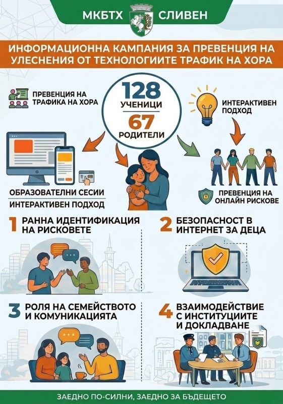 Общо 128 ученици и 67 родители се включиха в превантивни дейности, организирани от Местна комисия за борба с трафика на хора – Сливен съвместно с ОУ „Димитър Петров“ в рамките на информационна кампания за превенция на трафика на хора, улеснен чрез технологиите.