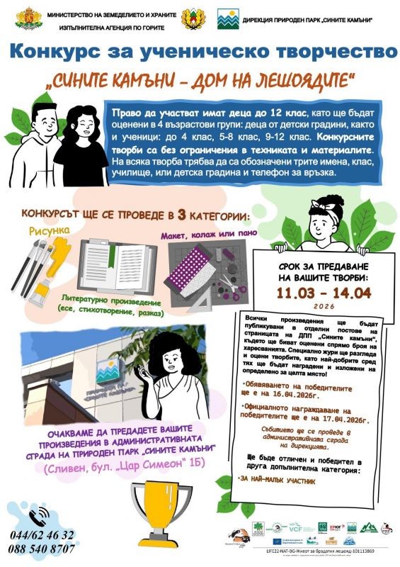 Дирекцията на Природен парк „Сините камъни“ обявява ежегодния конкурс за ученическо творчество за открит. Тази година той е посветен на темата „Сините камъни – дом на лешоядите“.
