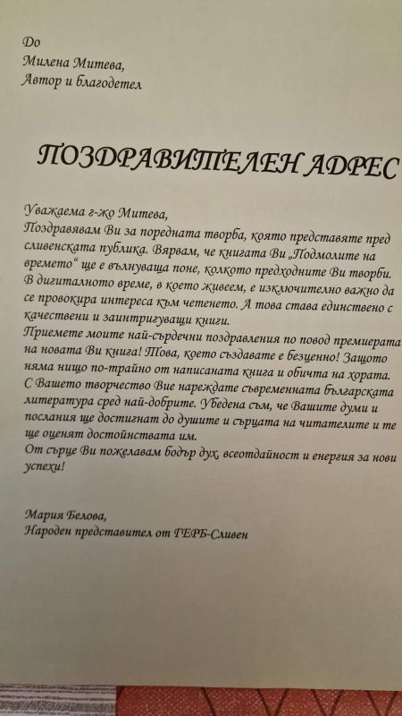 До авторката на книгата бе изпратен и поздравителен адрес от народния представител от ГЕРБ-Сливен Мария Белова.